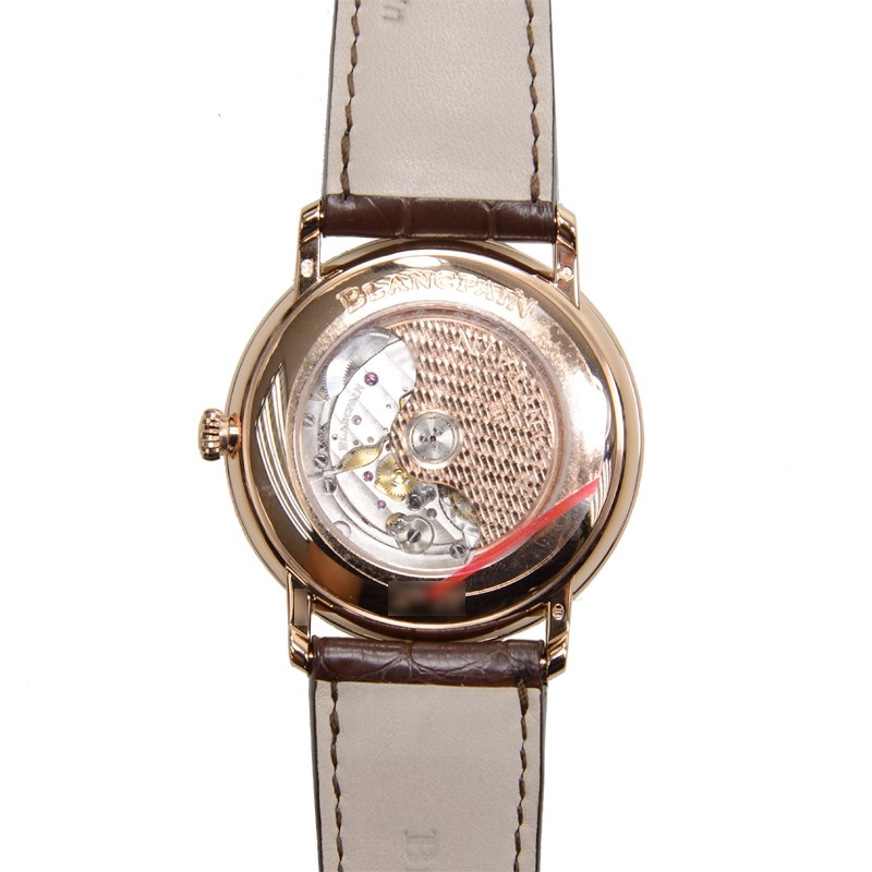 18 carat rose gold case with a brown alligator leather strap. Fixed- diamond set bezel. Opaline dial with rose gold-tone hands and Roman- diamond numerals hour markers. Dial Type: Analog. Date display at the 3 o'clock position. Blancpain Calibre 1151 automatic movement with about 100 hours of power reserve. Scratch resistant sapphire crystal. Case size: 40 mm. Case thickness: 8.90 mm. Round case shape. Band width: 22 mm. Water resistant at 50 meters / 165 feet. Functions: date, hour, minute, second. Luxury watch style. Watch label: Swiss Made. Blancpain Villeret Automatic Men's Watch 6651-2987-55B.