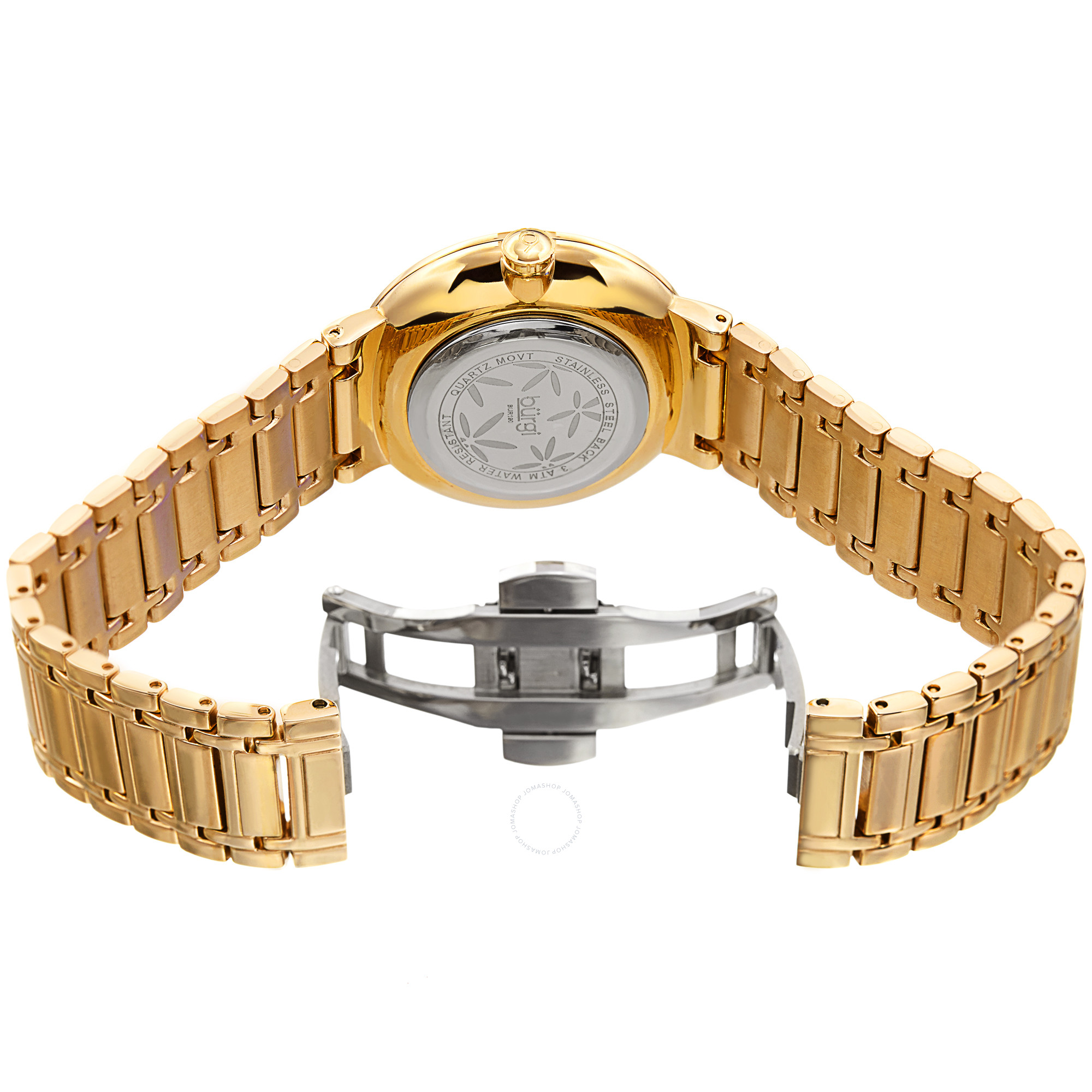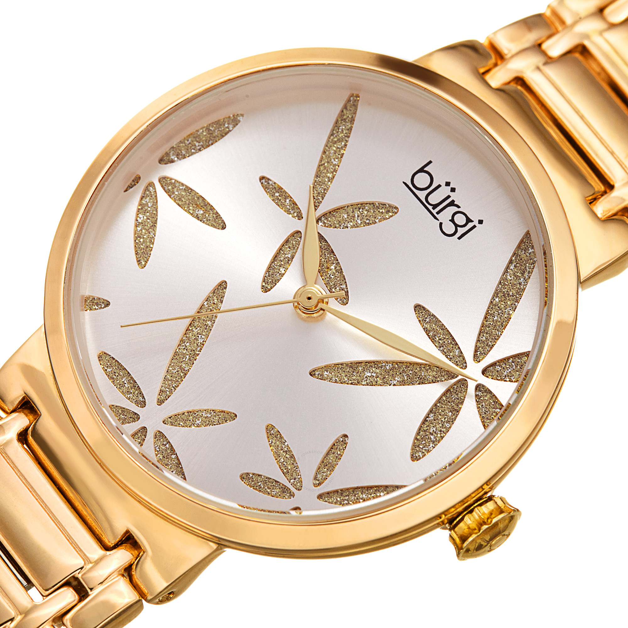 Gold-tone alloy case with a gold-tone stainless steel bracelet. Fixed gold-tone alloy bezel. Silver dial with gold-tone hands. Dial Type: Analog. Quartz movement. Scratch resistant mineral crystal. Push/pull crown. Solid case back. Round case shape, case size: 34 mm, case thickness: 8.5 mm. Band width: 18 mm, band length: 7.25 inches. Deployment with push button release clasp. Functions: hour, minute, second. Casual watch style. Burgi Silver Dial Ladies Watch BUR190YG.
